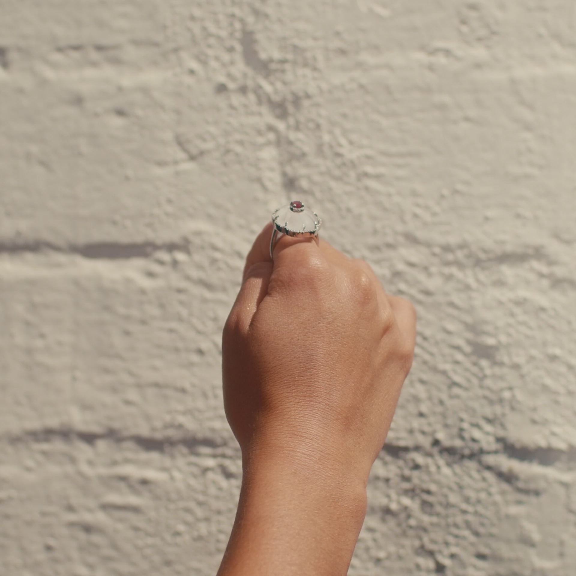 Mosaic Crystal Ruby Diamond Cocktail Ring featuring a mosaic white crystal carving set with diamonds in contrasting blackened silver and a center fiery oval pink ruby framed with more diamonds and blackened silver prongs in a fabulous cocktail ring.