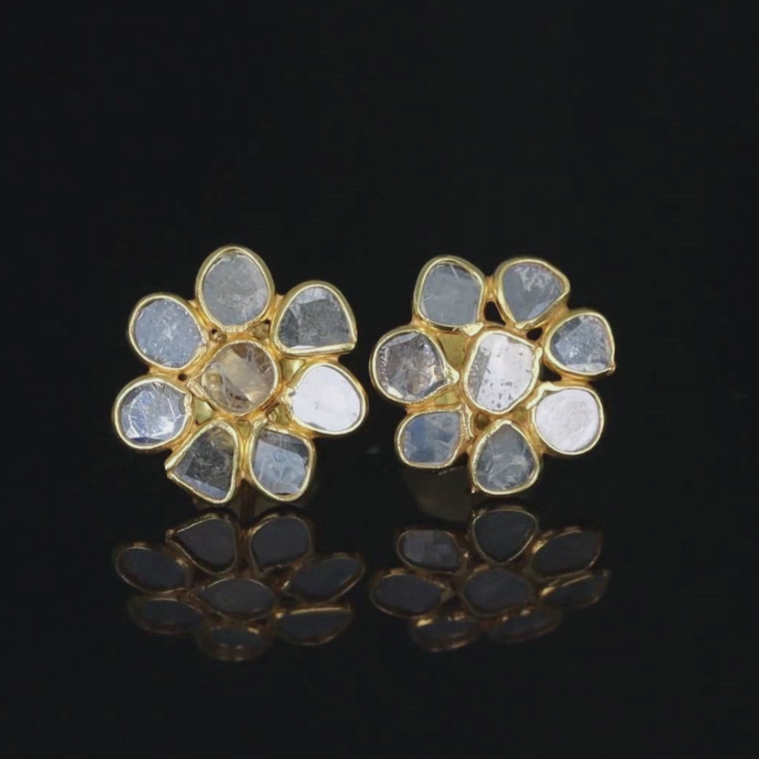 Kashmir Light Blue Sapphire Diaphanous Studs featuring finely shaved light blue rose cut sapphires on stud earrings in a flower design of hand-crafted gold filigree.