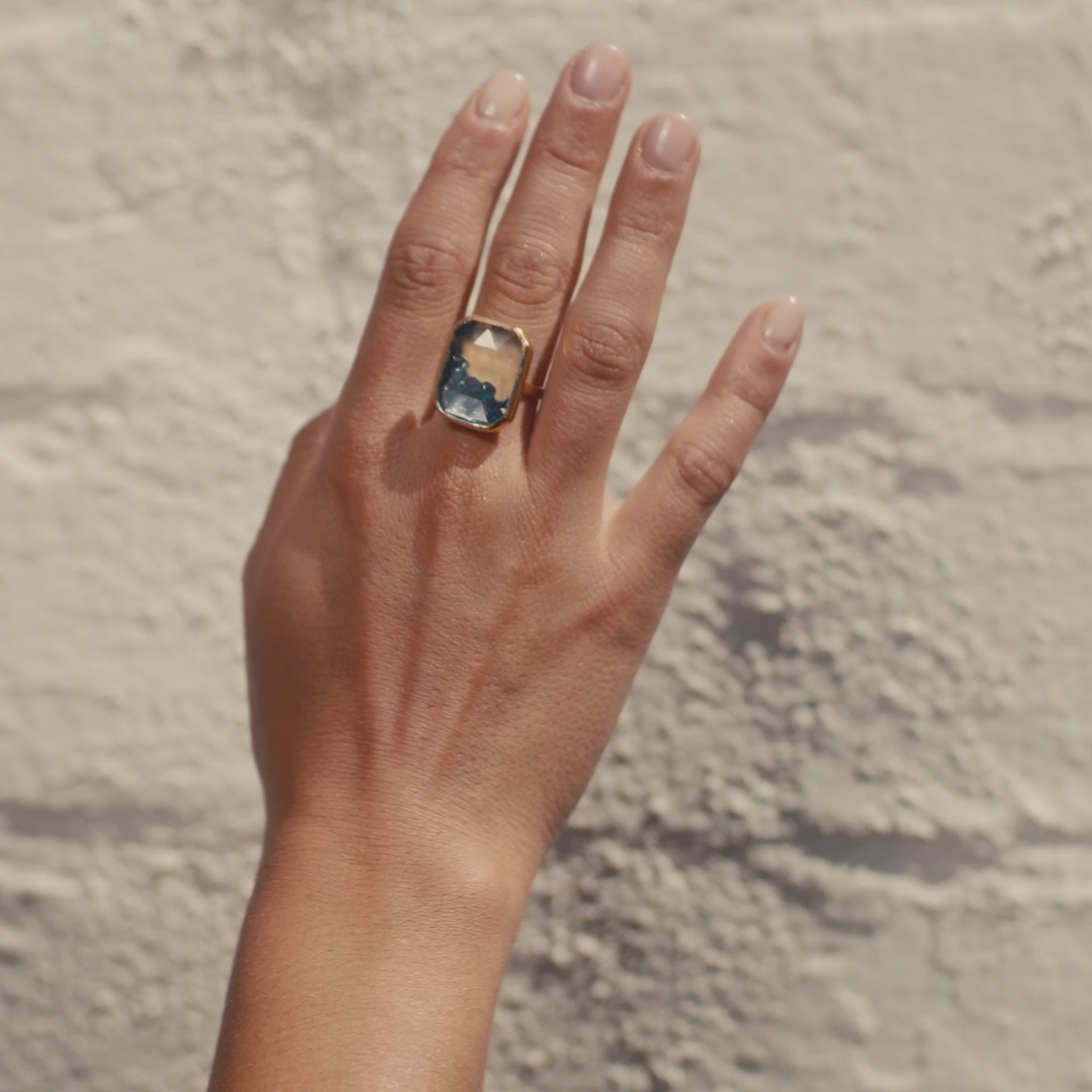 Blue Sapphire Glitter Globe Cocktail Ring. A fabulous stylish cocktail ring featuring a luminescent shimmering mass of glittering fluid blue sapphires encased in a checker cut carved crystal oval dome.